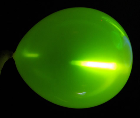 We also experimented with placing some standard and common glow sticks inside balloons. The most eye catching effect was simply from pushing a couple 22 Inch Glow Necklaces or a small handful of 8 Inch Glow Bracelets into a balloon as you are blowing it up to create a spectacular glowing spaghetti like effect inside your balloons. If you are looking for more of a constant central glow, try using a standard 4 Inch Glow Stick or 6 Inch Glow Stick inside of a frosted balloon to create that all-glowing ominous light effect. We also experimented with several brands of miniature glow sticks and surprisingly found that they did not work as well as we thought they would, the glow was very subtle and displaced to the bottom of the balloon. We certainly recommend using the larger sticks and the glow necklaces and bracelets however these will not work in helium balloons due to the weight. If you want to make your floating balloons glow, we recommend Miniature Glow Sticks or the LED Balloon Inserts.